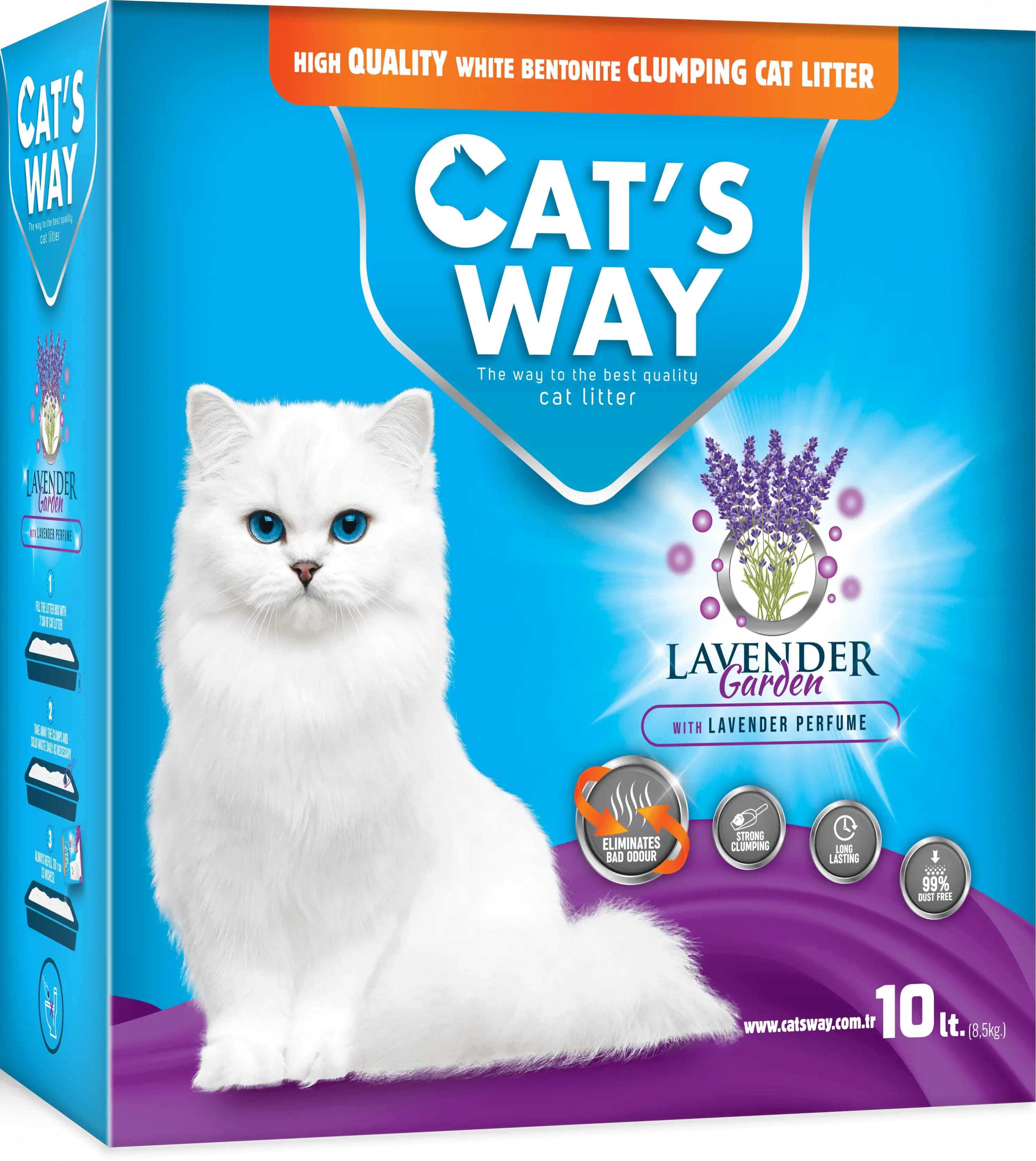Cat's Way Box Lavanta Kokulu Kedi Kumu, hoş lavanta aroması ile kötü kokuları maskeleyerek ferah bir kullanım deneyimi sunar. Doğal bentonit içeriği sayesinde sıvıyı hızlıca emerek sağlam ve kolayca temizlenebilen topaklar oluşturur.