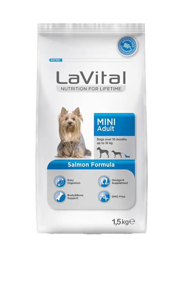 LaVital Somonlu Küçük Irk Yetişkin Köpek Maması, 10 ay ve üzerindeki küçük ırk köpeklerin özel ihtiyaçlarına göre geliştirilmiştir. Yüksek kaliteli somon proteini ve dengeli besin içeriği sayesinde hem günlük enerji ihtiyacını karşılar hem de bağışıklık ve sindirim sağlığını destekler.