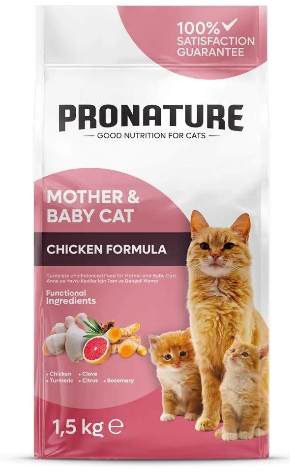 Pronature Tavuk Etli Anne ve Yavru Kedi Maması, hem hamile ve emziren kedilerin hem de yavru kedilerin beslenme ihtiyaçlarını karşılamak üzere özel olarak formüle edilmiştir. Yüksek kaliteli tavuk proteini ve sindirimi kolay içerikleri ile anne kedinin süt kalitesini artırırken, yavruların sağlıklı büyümesine destek olur.